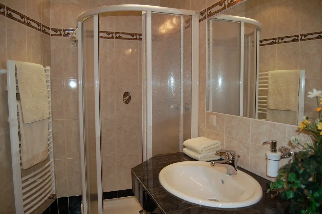 • Bad mit Viertelkreis-Dusche, WC und geräumigem Waschtisch